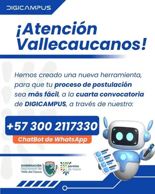 “Tenemos 180 cupos para carreras técnicas, tecnológicas, de pregrado y posgrado. Tenemos dos canales para poder registrarse y postularse: El primero, en la página web campusdigital.vallelcauca.gov.co y el nuevo, nuestro chatbot con inteligencia artificial que por medio de tu celular, por WhatsApp, podrá registrarse y postularse”, indicó el secretario de las TIC del Valle, Gabriel Enrique Ferrer.