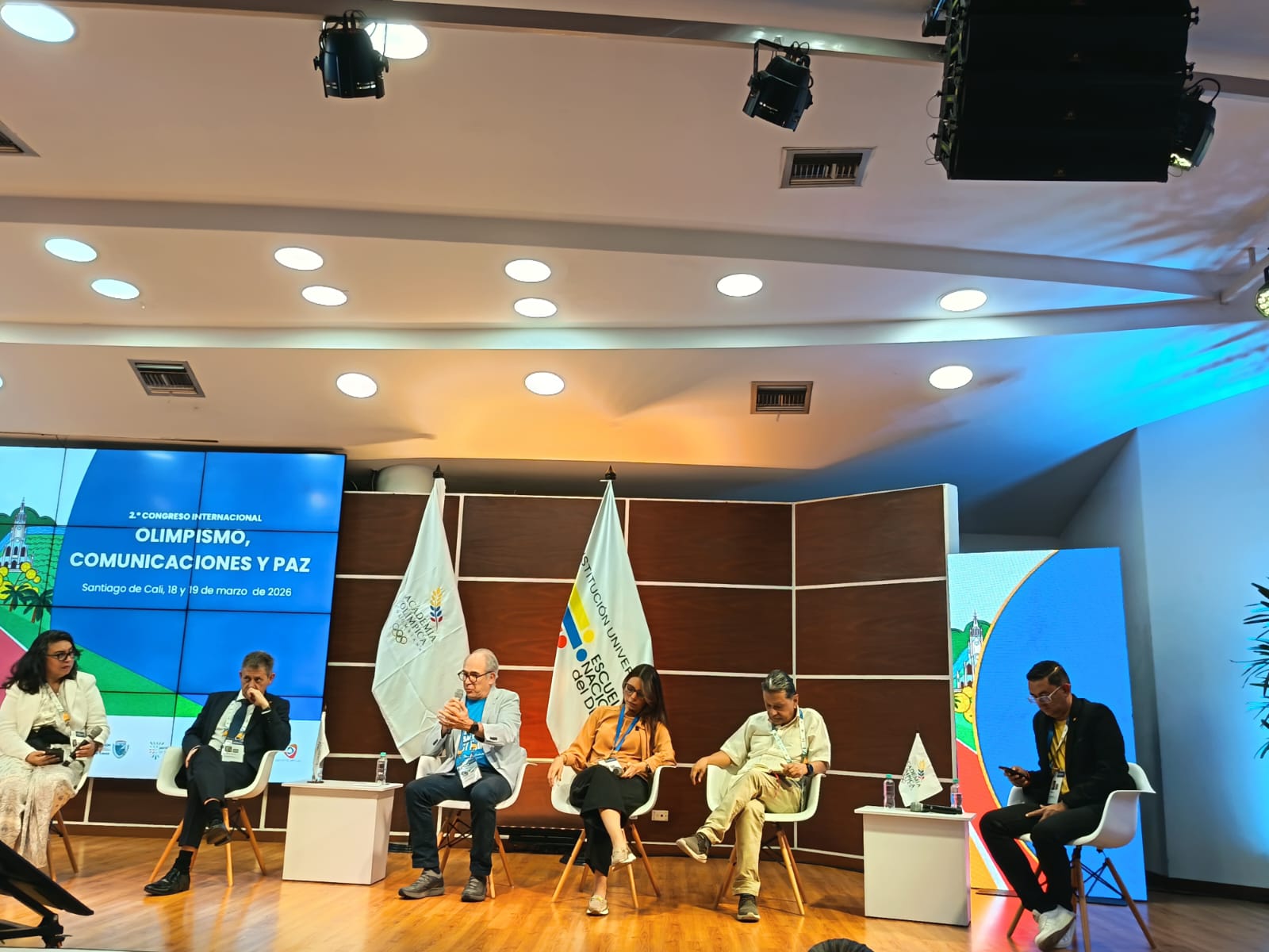 Se adelanta en las instalaciones de la Institución Universitaria Escuela Nacional del Deporte el segundo congreso internacional olimpismo comunicaciones y paz; de la mano de la inteligencia artificial; el evento es conducido por los panelistas.