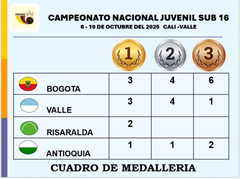 La liga de Bolo de Bogotá dominó el cuadro de medallería en la Categoría Sub 16 con 3 oros, 4 platas y 6 bronces.