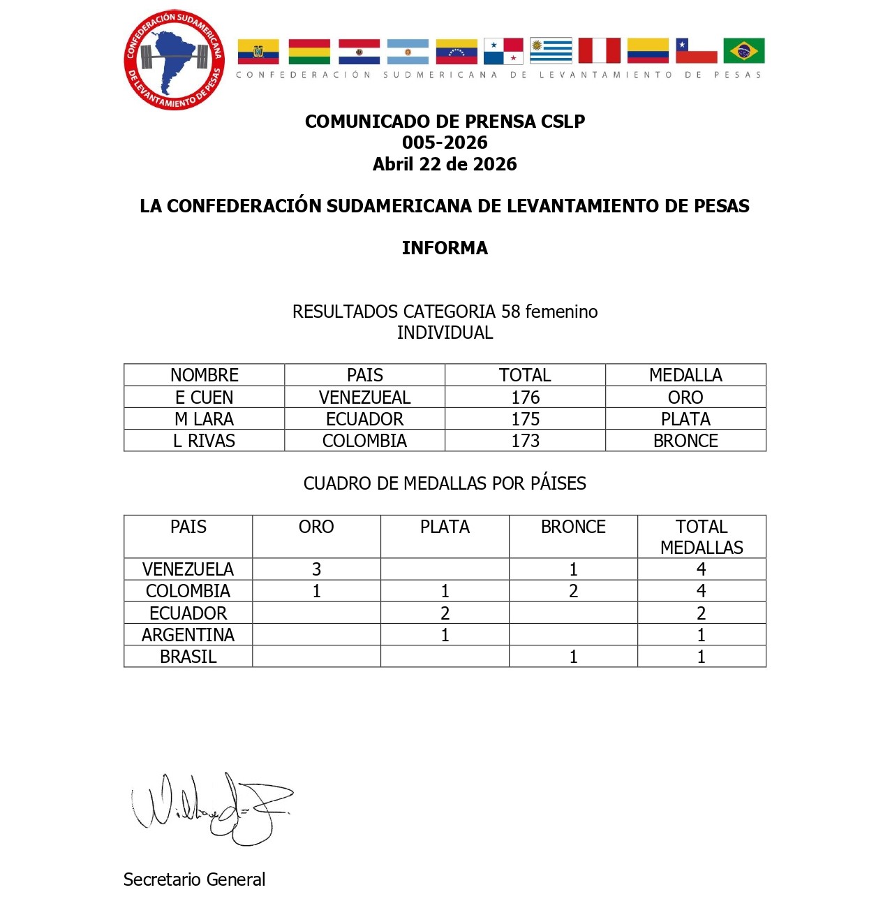 Al cierre de la jornada Laura Rivas ganó el bronce con un registro total de 173kg, detrás de la venezolana Elizabeth Maoly, medallista de oro y Marely  Lara de Ecuador medalla de plata.