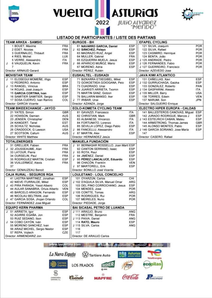 Los colombianos que hasta ahora han confirmado, Iván Ramiro Sosa (Movistar Team) y Jhojan Orlando García (Caja Rural) . A raíz de su caída en el Tour de Turquía y de que es la imagen principal del póster del evento, Nairo Quintana (Arkea) no asistirá y no defenderá su título obtenido en el 2021.